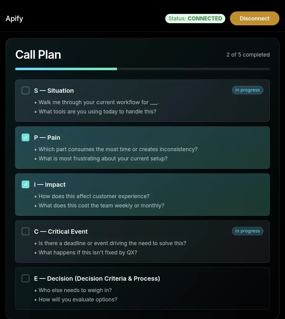 Stay on track with visual indicators that show which topics you've covered — pain points, budget, next steps — and what's still left to close.