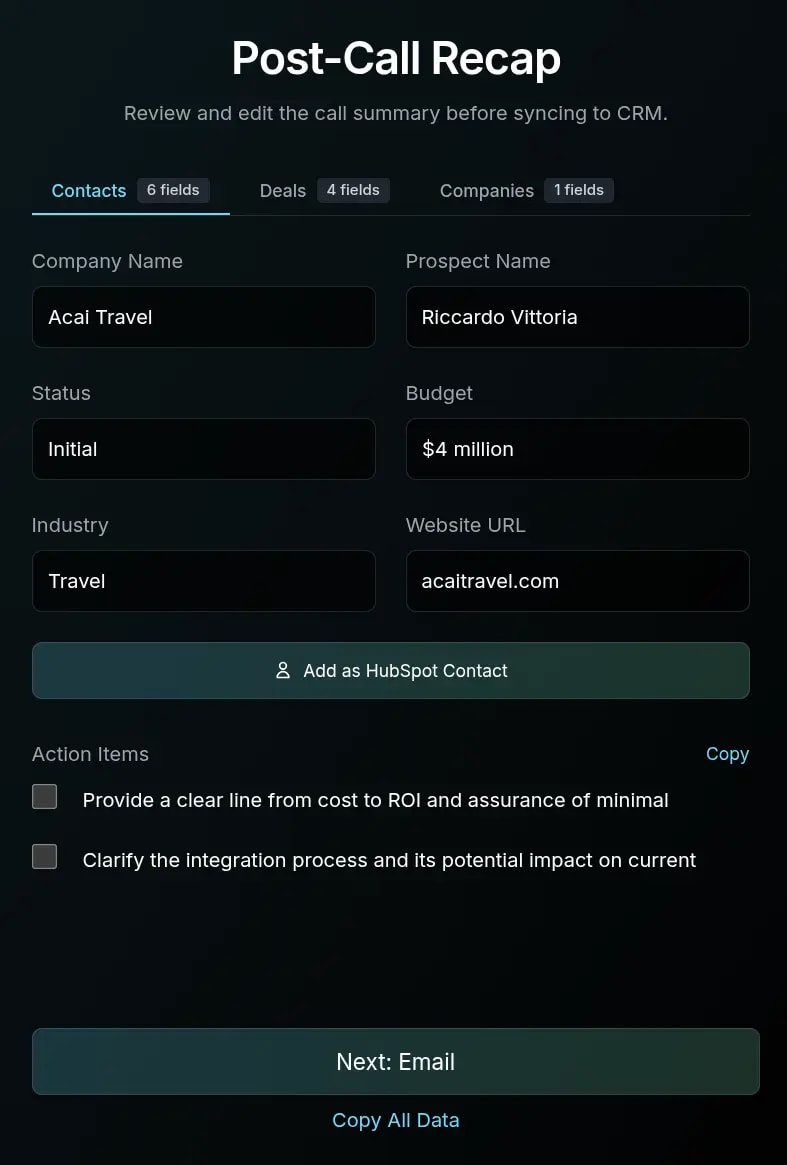 Automatically pre-fill CRM fields with accurate notes and data — review, edit, and approve in seconds.