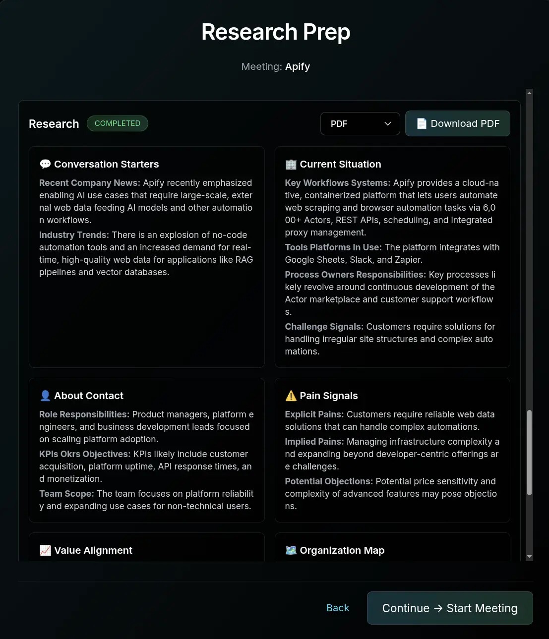 Get instant insights on your meeting participants, company background, and relevant conversation starters — no tab-hopping required.